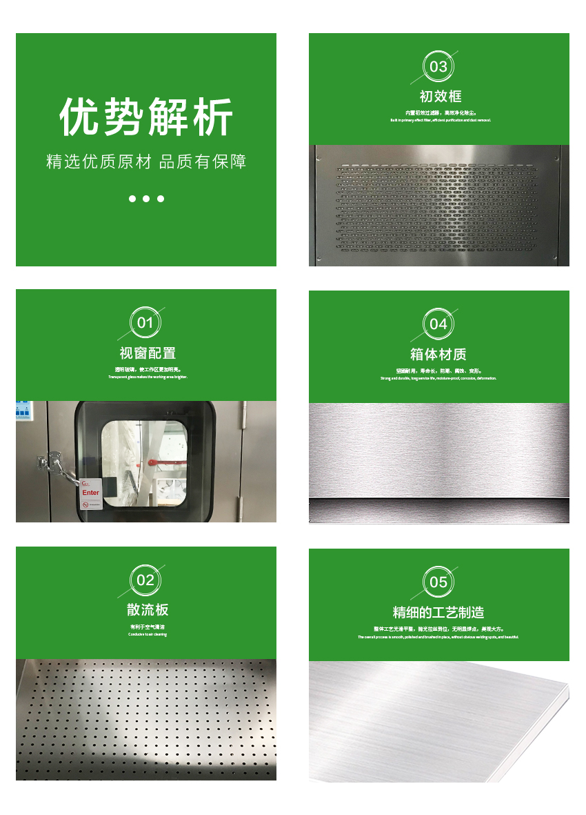 5、風淋傳遞窗裝有高效空氣過濾器、風機等凈化裝置,噪音≤65Db,配不銹鋼噴嘴,風速≥22-27M/S;