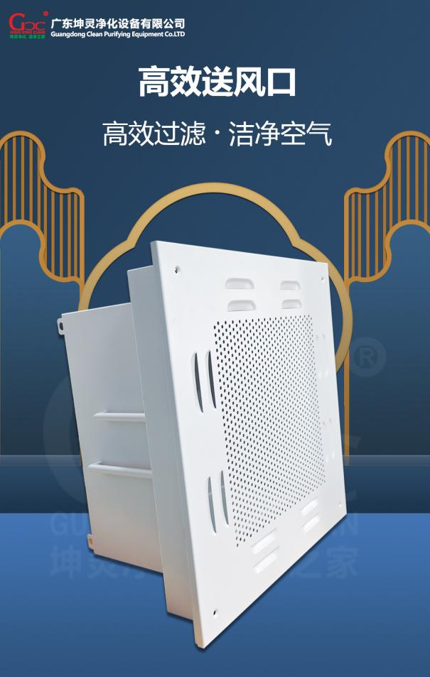高效送風口為千級、萬級、十萬級凈化空調系統較為理想的終端過濾裝置,可廣泛于醫藥、衛生、電子、化工等行業的凈化空調系統。高效送風口是用作改造和新建1000-300000級各級潔凈室的終端過濾裝置,是滿足凈化要求的關鍵設備。高效送風口包含靜壓箱,散流板,高效過濾器,與風管的接口可為頂接或側接兩種方式。